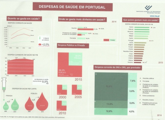 Estranhamente, este mapa contém elementos contraditórios com outros dados do mesmo INE. Nomeadamente no que respeita à despesa pública com saúde onde no gráfico do canto superior esquerdo é apresentada uma descida de 2014 para 2015 quando de facto ocorreu uma subida de 10.319,2 milhões de € para 10.664,8.