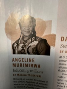 Outra escolha minha foi Angelina Murimirwa, nascida no Zimbabwe em 1990. Embora fosse uma estudante brilhante, a família não teve posses para que ela continuasse os seus estudos. Conseguiu prosseguir com o apoio de uma organização chamada CAMFED (Campaingn for Female Education) e hoje Angelina é a CEO dessa organização ajudando milhões de raparigas a frequentarem a escola no Ghana, Malawi, Tanzania, Zambia e Zimbabwe. Ela acha, e bem, que a educação conduz a comunidades mais fortes e saudáveis.